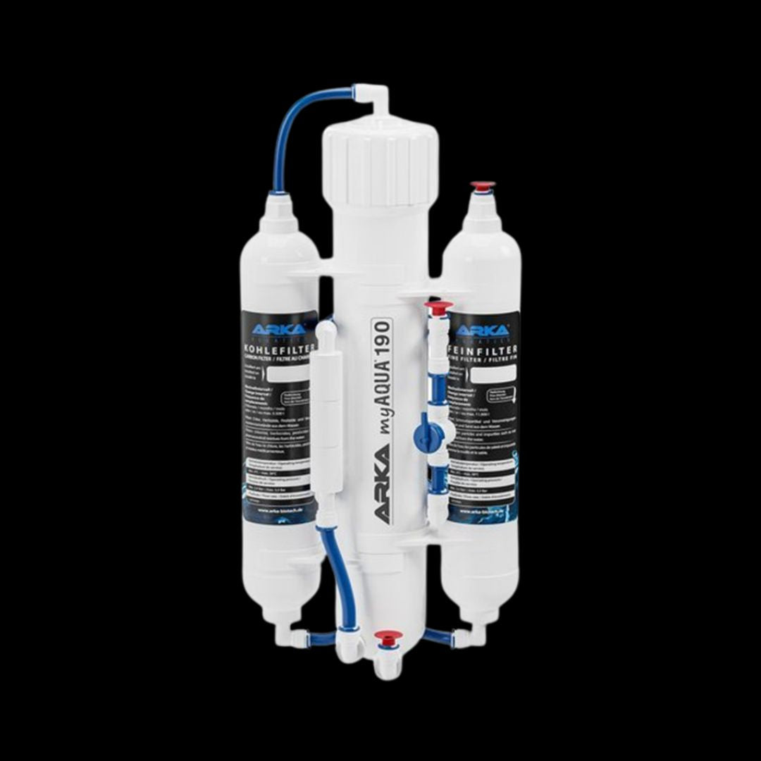 ARKA myAQUA® er et høyeffektivt og brukervennlig revers osmoseanlegg som raskt og effektivt fjerner opptil 99 % av salter, bakterier, tungmetaller, nitrat, fosfat og andre forurensninger fra springvann. Perfekt for både saltvann- og ferskvannsakvarier, og ideelt for deg som ønsker rent og trygt vann til akvariet ditt.